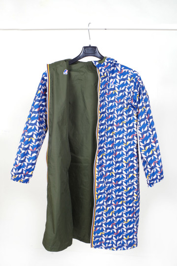 K-Way giacca modello lungo con cappuccio, tasche laterali con cerniera, maniche arricciate e zip lunga, alcuni modelli reversibili. Proposti in tinta unita (bianco, giallo, rosa, azzurro, beige, arancio) e fantasia geometrica.