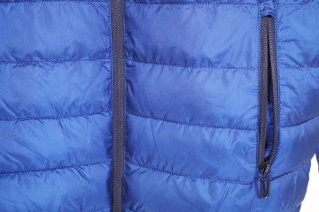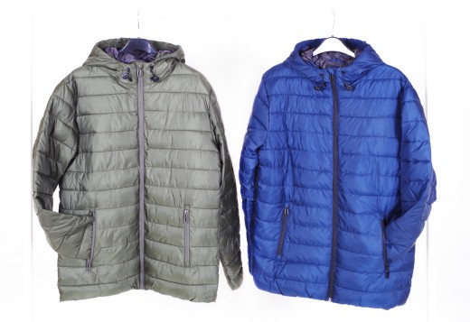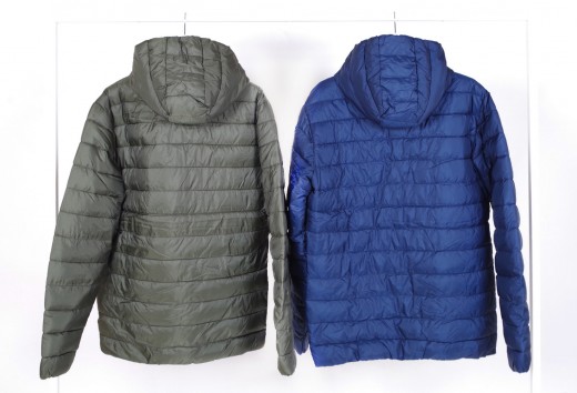 Giacche eco-imbottite a disegno orizzontale con cappuccio e zip a tutta altezza, proposte in due colori: verde militare e blu