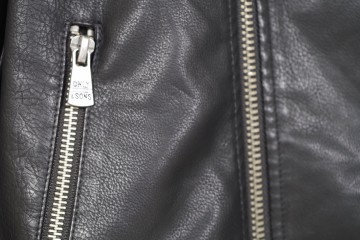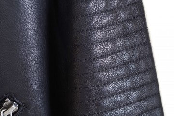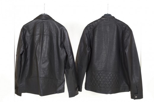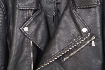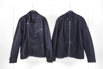 Chiodo in eco-pelle nero semi-lucido proposti in due modelli in varie taglie, con zone rinforzate e zip a tutta altezza