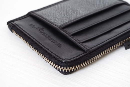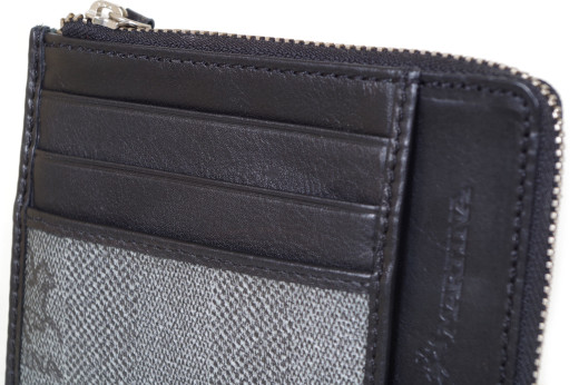 Portacarte proposto in un unico modello realizzato in tessuto tecnico con finiture in pelle. Piatto e assolutamente poco ingombrante ha comunque una zip portamonete e varie taschine porta-carte
