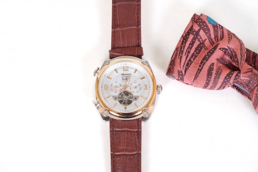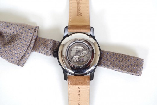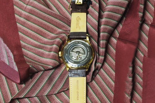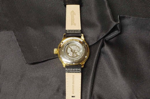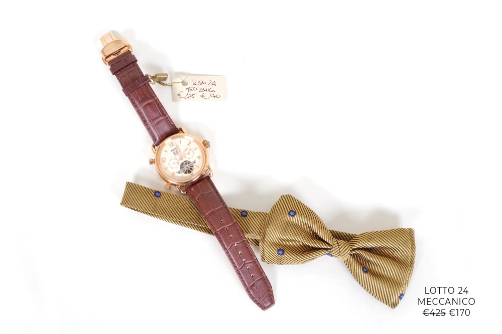 Lotto 20 : orologio meccanico con cinturino in cuoio naturale, cassa color oro satinato, lunetta e quadrante neri