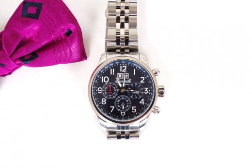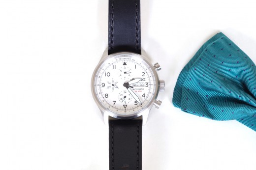 Lotto 23 : orologio cronografo meccanico con datario, cinturino in cuoio nero, cassa in acciaio satinato e quadrante bianco
