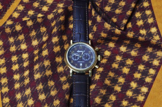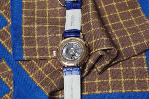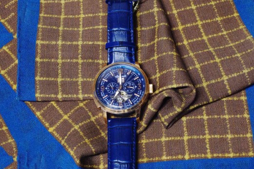 Lotto 4 : orologio cronografo meccanico con datario, cinturino in pelle blu stampa cocco, cassa color oro rosa, quadrante blu