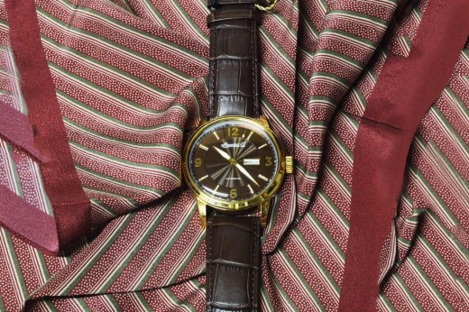 Lotto 6 : orologio meccanico con datario, cinturino in pelle marrone stampa cocco, cassa color oro giallo, quadrante marrone