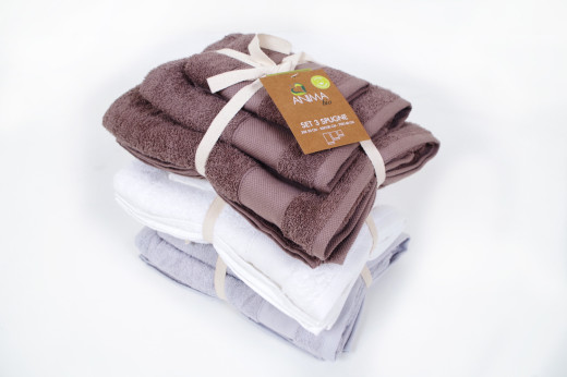Set di tre asciugamani in spugna disponibili in tre colori a tinta unita: bianco, grigio perla e marrone