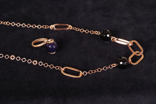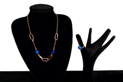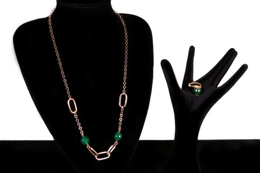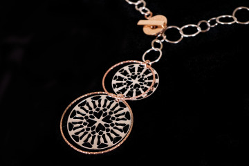 Pietre naturali colorate impreziosiscono collane, bracciali, anelli realizzati in argento in galvanica oro rosa. Figure geometriche si alternano nella forma e nella dimensione dando vita ad un gioiello unico e originale e prodotto artigianalmente