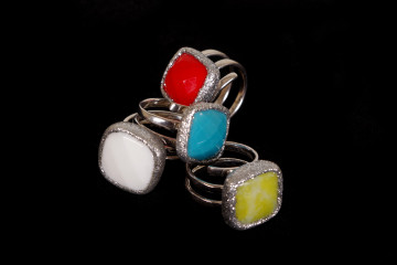 Argento con effetto brillantato che disegna l’incastonatura di pietre naturali semipreziose proposte in vari colori: bianco, giallo, rosso, turchese… Collane orecchini ed anelli dal design semplice e moderno facilmente abbinabile a qualsiasi tipo di outfit