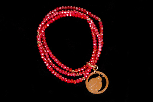 Collane e bracciali composti da fili doppi o tripli di perline di vetro colorate trattenute ciondoli portafortuna e nappine in filo di seta