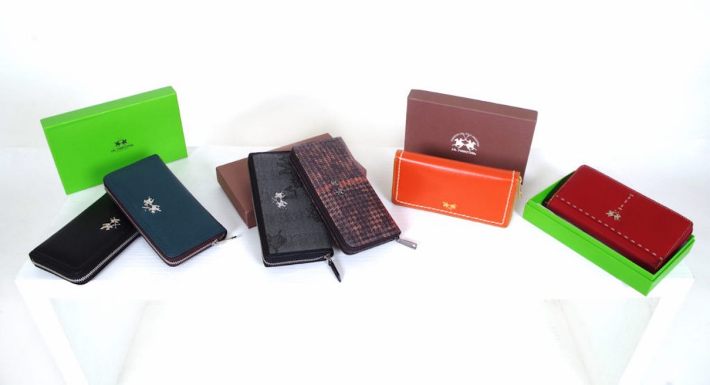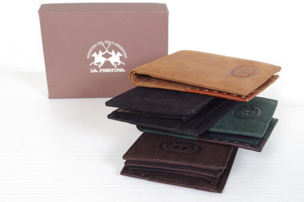 Portafogli firmati La Martina realizzati in pelle lucida o pelle scamosciata e disponibili in linea classica o casual Differenti modelli provvisti di portamonete e patella porta carte da € 32 a € 38