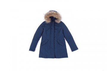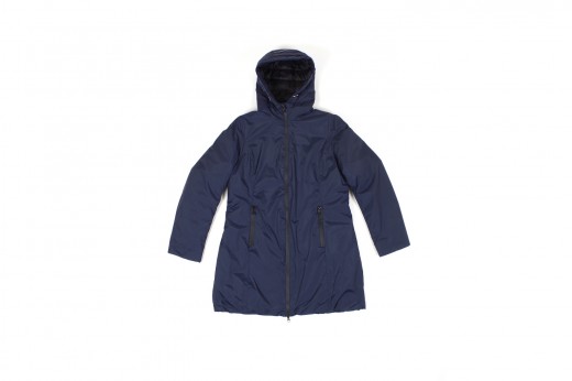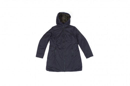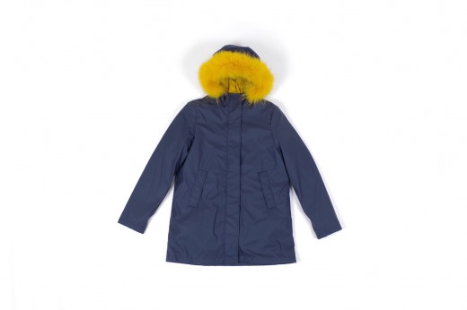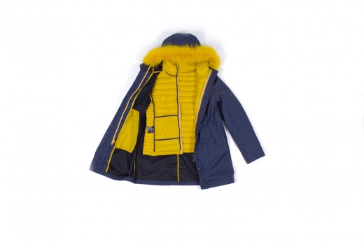 Parka cerato con piumino interno staccabile : 2 capi in uno utilizzabili in primavera, autunno e inverno Parka in tessuto tecnico blu e finitura collo in vero pelo colorato All’interno piumino 100 gr a manica lunga in colori brillanti