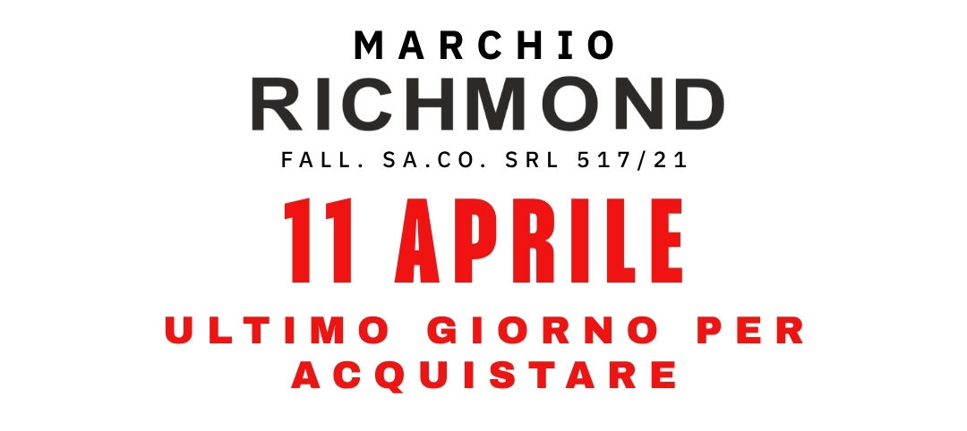 03Apr26Abbigliamento, calzature, donna, Fine procedura fallimentare, gioielli, uomo Fall. SA.CO. SRL 517/21: FINE PROCEDURA BENI A MARCHIO RICHMOND SABATO 11 APRILE: ULTIMO GIORNO PER POTER ACQUISTARE Tweet