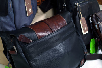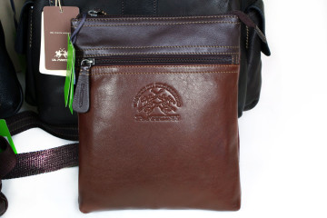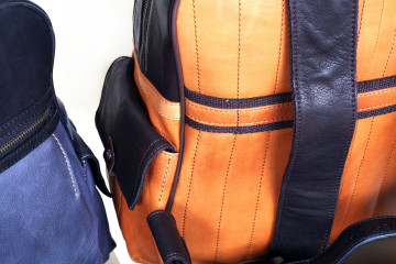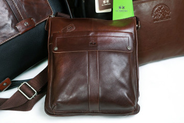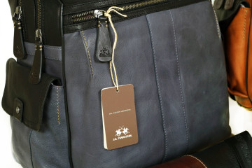 La Martina per Lui : zaini e borselli in morbidissima pelle color cuoio o nero con effetto brilliant e mat e particolari in grigio polvere e arancio