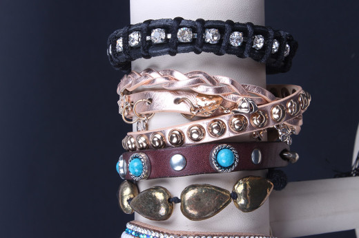 Bracciali in pelle e tessuto con punti luce stile tennis e fibbia brunita Fili di cuoio colorati e fiocchi di tessuto si alternano alle catene in lega di metallo arricchite da pepite dorate e ciondoli abbinabili a collane ed orecchini